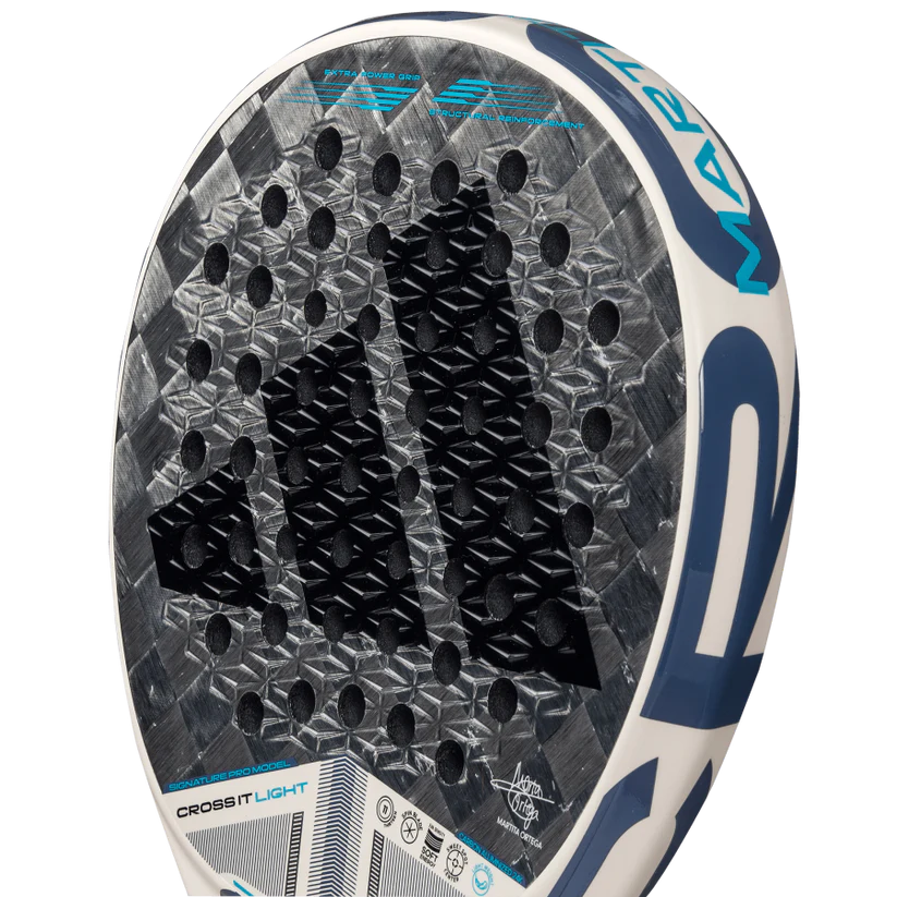 Marta Ortega's racquet combines lightweight agility with cutting-edge technology, giving you the winning edge on the court. The CROSS IT LIGHT 3.4, Marta Ortega's signature racquet, is crafted for players who value agility without sacrificing performance. This lightweight design combines the best features of the CROSS IT range, enhancing manoeuvrability and elevating your game. Dynamic Air Flow technology optimises airflow through the racquet's heart, significantly reducing air resistance and allowing for quicker, sharper movements. The extended Power Extra Grip maximises inertia, empowering players to unleash powerful shots with ease. The innovative 11 Thirteen hole arrangement increases rigidity and durability, ensuring explosive hits. Meanwhile, the Spin Blade Mold features 3D relief for enhanced spin capabilities, and the Soft Energy EVA rubber delivers exceptional ball output without compromising power. Made with Carbon Aluminized 24K, this racquet perfectly balances a rigid surface for power and a soft touch for superior playability. Tecnology: DYNAMIC AIR FLOW The aerodynamic structure of the racquet’s core facilitates airflow, enhancing shot speed and overall performance. This adidas technology features strategically placed holes designed to minimise air resistance in the area between the handle and the head, improving ease of handling and execution speed. 11 Thirteen The racquet’s hole distribution improves rigidity, power, and impact resistance. This is achieved through a combination of 13 standard-sized holes with 11 smaller holes in the central area. The smaller holes provide greater solidity in the zone most exposed to high-intensity impacts. Extra Power Grip This innovative longer grip significantly increases the racquet's inertia during shots, especially in offensive strokes. The longer-than-usual distance between the bottom of the handle and the top of the head allows for greater swing speed and more powerful impacts. Specifications: Brand: Adidas Shape: Round Balance: Even Level: Advanced Gender: Women Core: EVA Soft Energy Face: Carbon Aluminized 24k Weight: 345-360gr Surface: Rough Playing Style: Control
