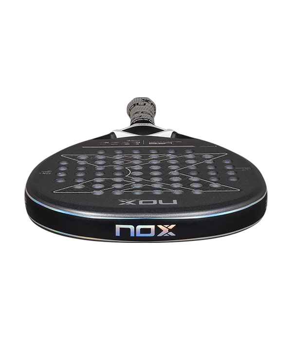 NOX LA10 Quantum 12K 2025 racket, Leo Augsburger's racket for the 2025 season. A new mold that also slightly lengthens the grip. On the sides, EOS Flap technology has been incorporated, perforations that improve manageability and redistribute the weight of the racket. The Quantum 12K combines 12K carbon fiber and HR3 Eva core offering an exceptionally comfortable hitting sensation, with an intermediate feel, It incorporates EXCLUSIVE SPIN technology, with a double rough finish, a hexagonal 3D finish in the center and a sand texture in the rest ,Interchangeable laces thanks to the Smartstrap system.