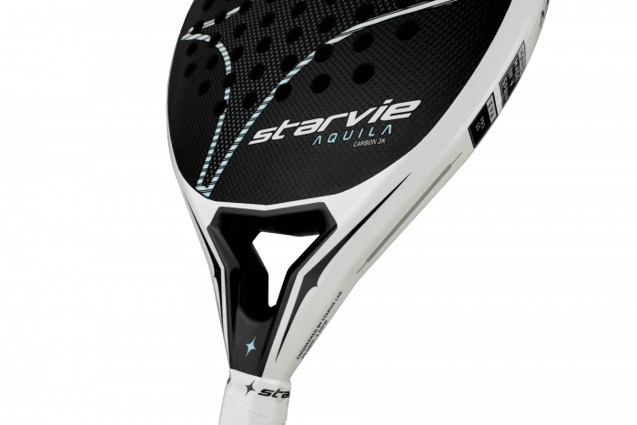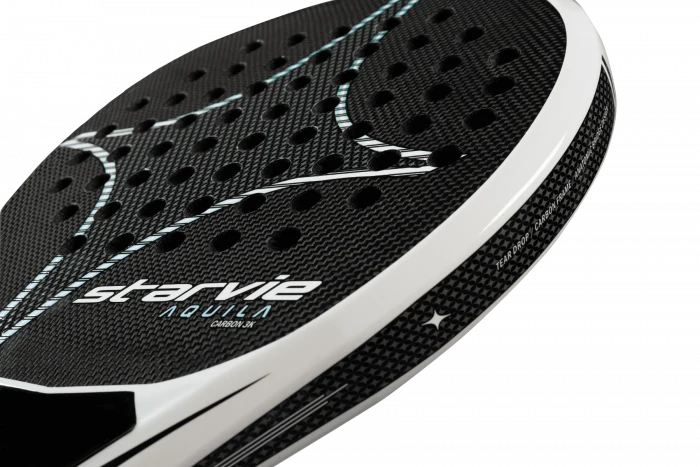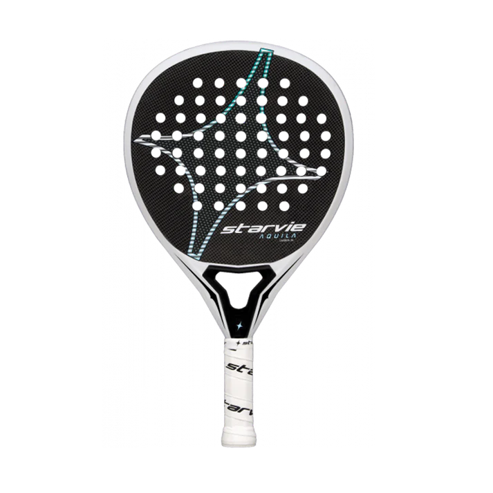 Starvie Aquila Pro 2025 Padel Racket It stands out for being a comfortable racket, which offers good sensations on court with a perfect balance between power, control and ball speed. It is also surprisingly easy to handle thanks to its Soft 30 rubber density in its core. It is designed for mid-level offensive players looking for racket with excellent manageability. Carbon Fibre and Tubular Carbon It has a 100% 3K carbon composition both in the head and in the frame of the racket. Soft 30 rubber density is designed for a generic game that suits any type of player. It contributes to achieving greater ball speed and ease in the execution of the stroke. Teardrop shape, its optimum point is balanced towards the tip. Roughness in the decal of the racket. Power Balance, technology located in the heart of the racket that optimises the distribution of the racket's weight, thus providing greater balance towards the head and achieving excellent power. Reinforcement Torsion System, applied to the core of the racket to help reduce the vibrations transmitted to the handle of the racket. Anatomic Bridge Design, technology applied in the heart of the racket. This system has been added to give it an anatomical shape that makes it easier to adopt a more comfortable posture when gripping the racket with both hands. It is 100% made in Spain Specifications: Brand: Starvie Shape: Teardrop Balance: High Level: intermediate Gender: Men Core: Pro 50 rubber Face: Carbon 3K Weight: 350-370 grs Surface: Rugged Playing Style: Control/Power