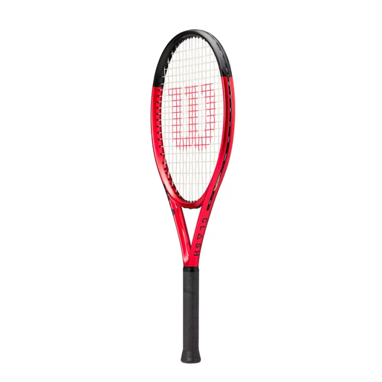 Description: The Clash 26 v2 sets the bar high for design, comfort and game-changing performance in junior rackets. Coated with a rich red finish for a sleek look on the court, this racket feels remarkably arm-friendly thanks to its FORTYFIVE° carbon construction. This layup creates maximum flexibility and stability through the swing, which enables young players to swing aggressively and confidently without spraying the ball. Tip of hoop features revised construction for an enlarged sweet spot, permitting more forgiveness on off-center contact. Racket features Agiplast plant-based end cap, bumper and grommets to add an element of sustainability and reduce its overall environmental footprint. •Junior length and weight ideal for ages 10-12 •FORTYFIVE° comprises a patent-protected carbon construction that creates maximum flexibility and stability at impact for an uncompromising blend of power, control and feel •Revised construction at tip of hoop supplies additional consistency and an enhanced sweet spot •Design features red and black anodized matte finish for a clean, rich look on the court •Horizontal Bending creates industry-leading flexibility for increased control on horizontal, traditional swings •Vertical Bending increases dwell time for players with vertical, modern swings •Torsional Bending features proprietary carbon mapping to stabilize the extreme flexibility on off-center hits •Parallel Drilling provides a consistent, more forgiving string bed response •Agiplast plant-based bumper, grommet and end cap components reduce environmental footprint *NO Cover provided – purchase separately. Cross Section : 24.5mm Flat Beam Grip Size : 3 7/8 Head Size : 100 sq in / 645 sq cm Length : 26 in / 66 cm String Pattern : 16×19 Unstrung Balance : 31.5 cm / 4 pts HL Unstrung Weight : 245 gm