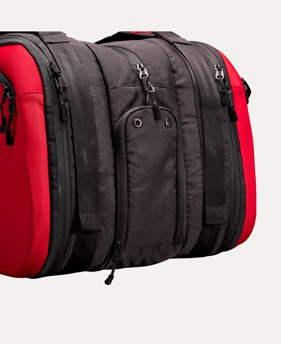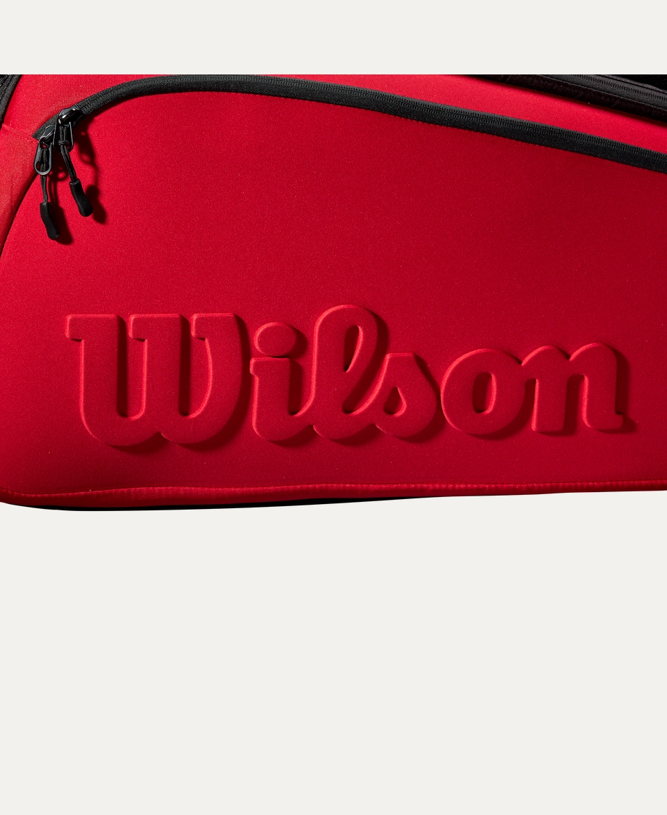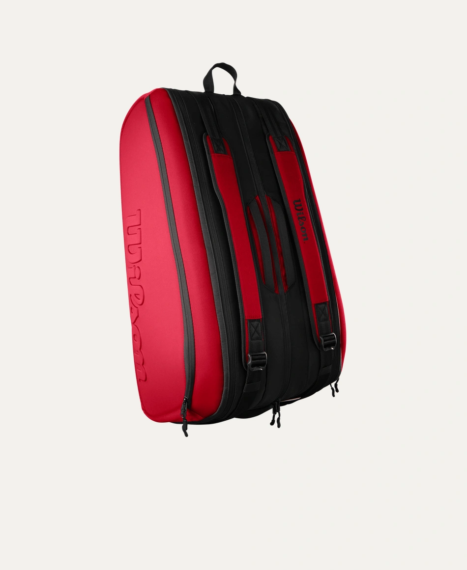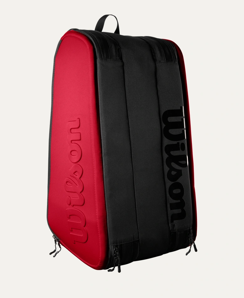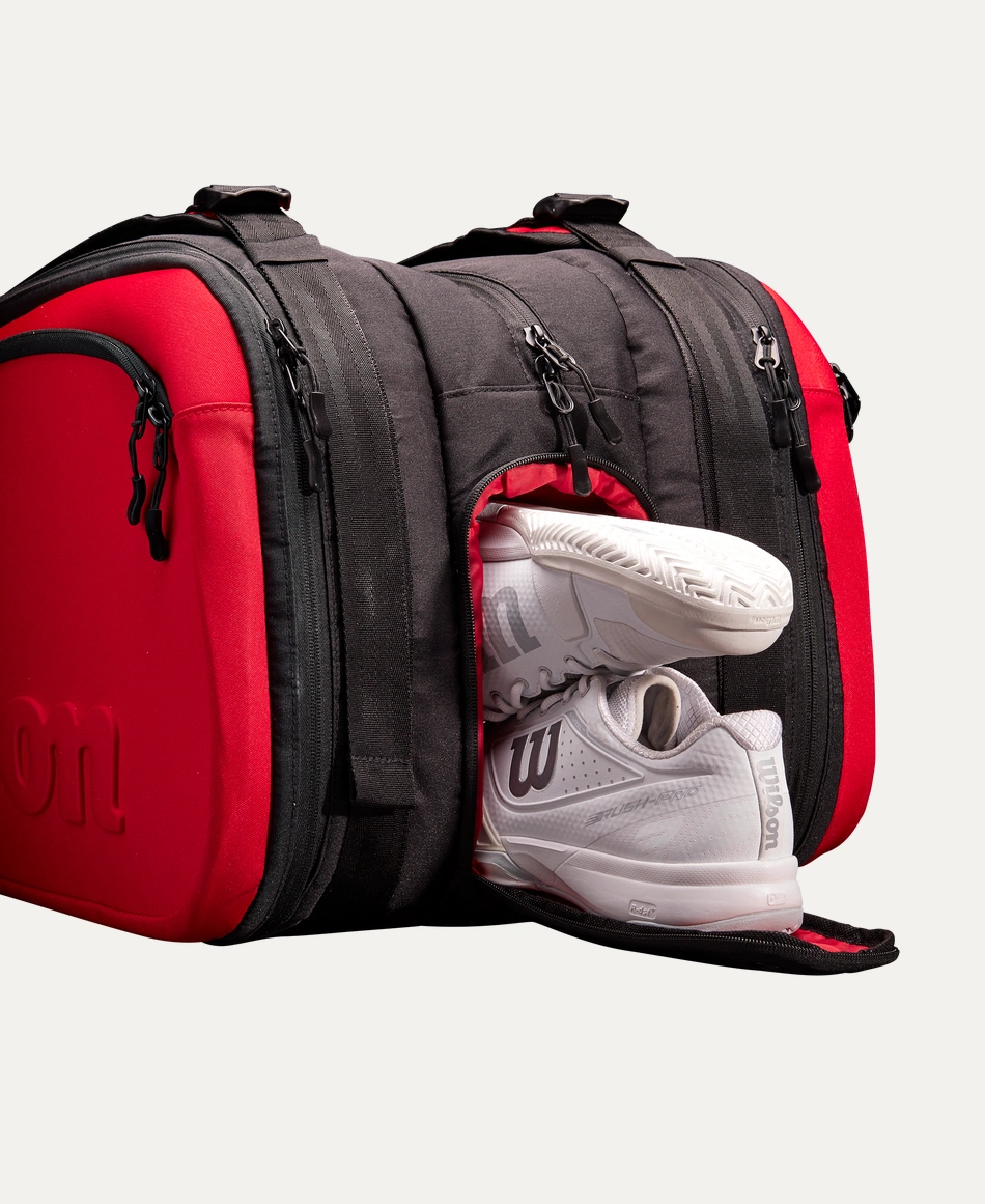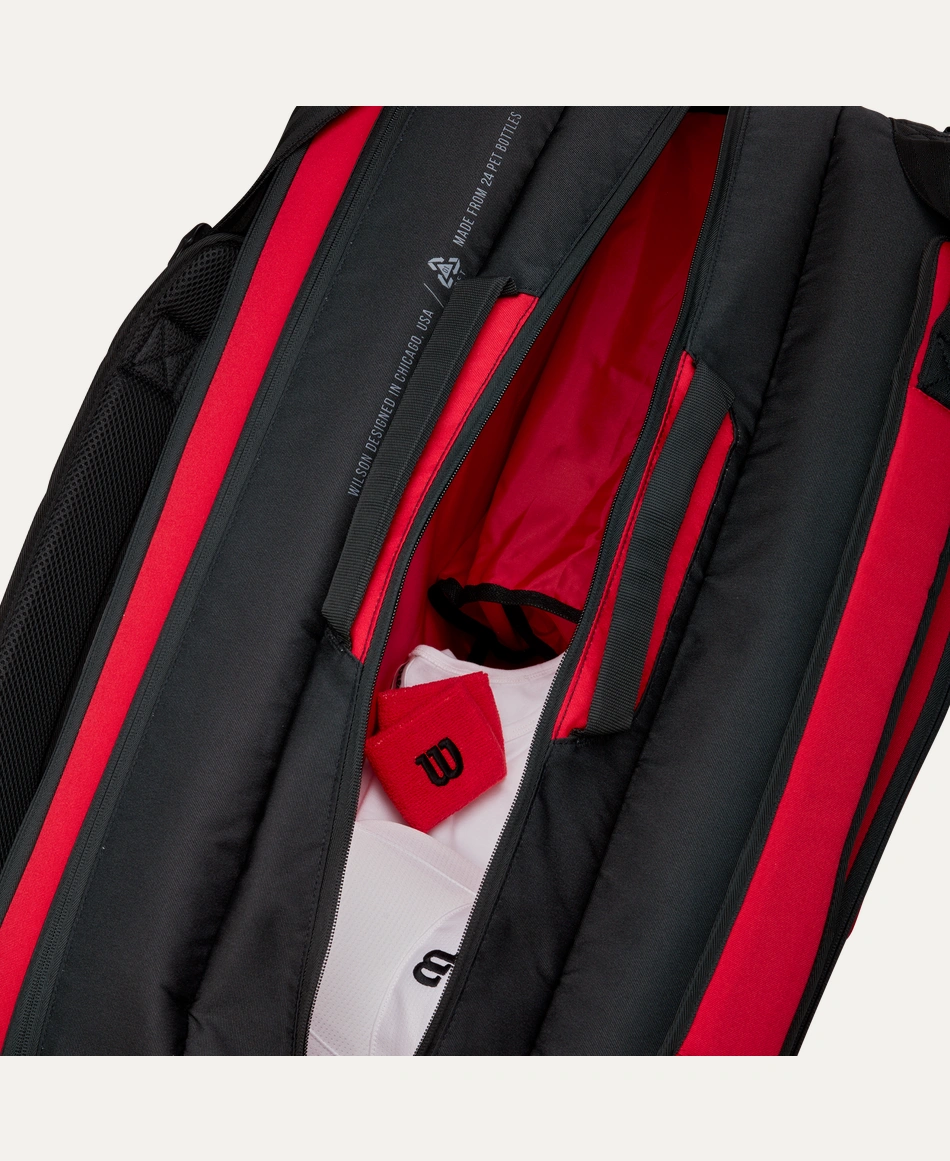 The perfect accomplice to a groundbreaking racket franchise, the Clash V2 Super Tour collection integrates rich, innovative design with a plethora of beneficial features for tennis players. This Super Tour 15 Pack holds up to 15 tennis rackets across three main compartments for tennis equipment, including two lined with Thermoguard to protect against extreme temperatures. Additional features include a pair of large exterior side pockets for extra personal storage, a zippered shoe pocket with ventilation for added breathability and a dual carry system for alternative modes of carrying. Comprising a recycled PET polyester shell fabric made from 24 PET bottles, this bag's innovative design superbly complements the Clash V2 performance racket line with its rich, red hue and embossed Wilson logo.