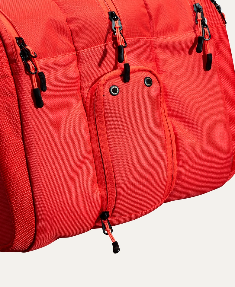 - Compartment fully encloses rackets, larger gear and other equipment.
