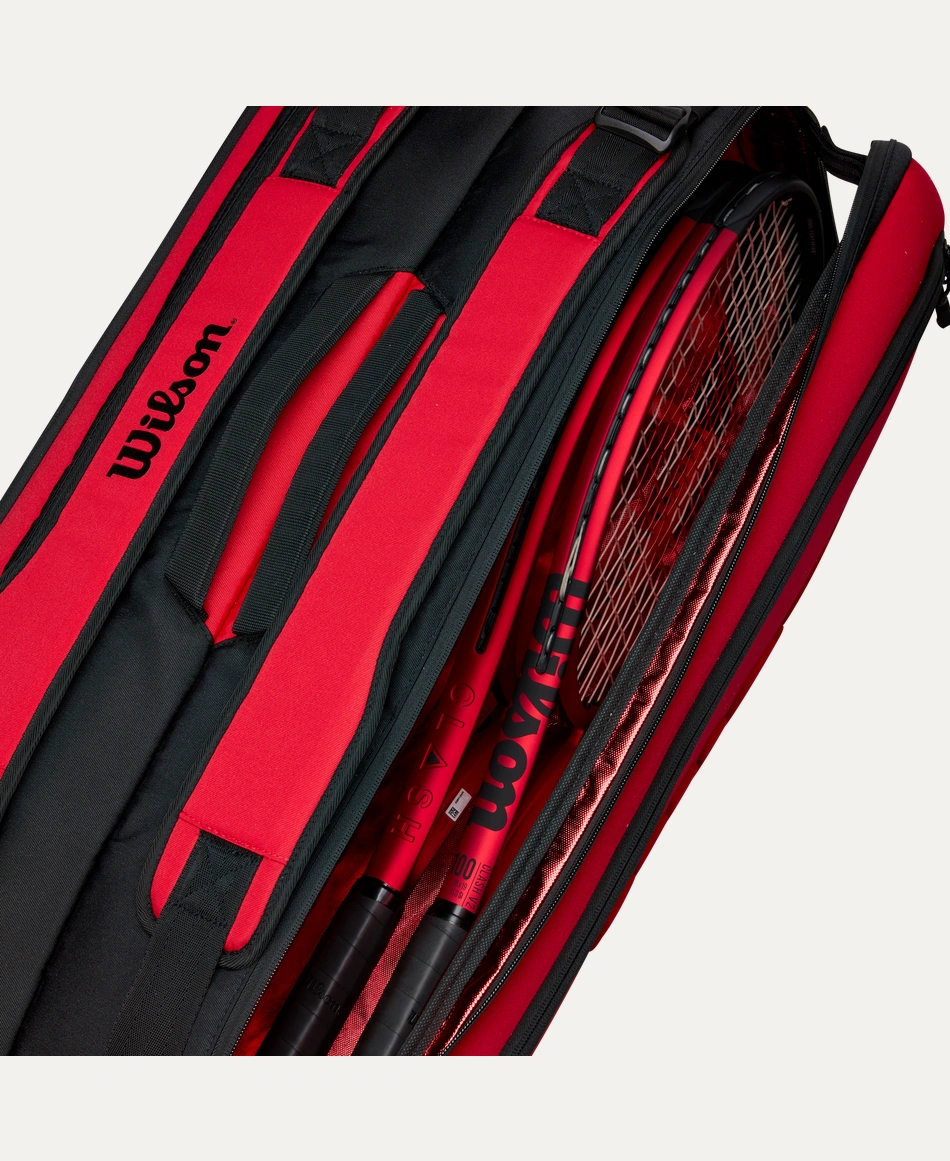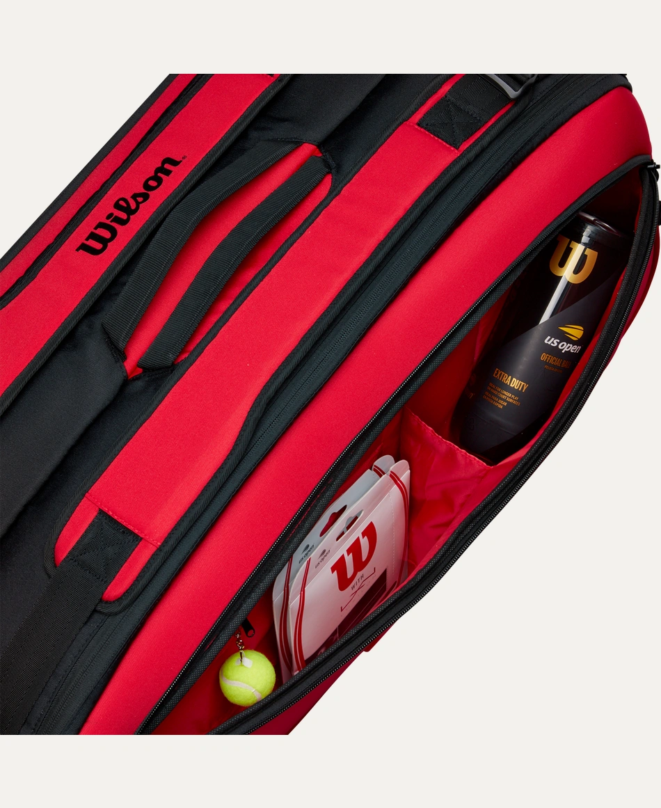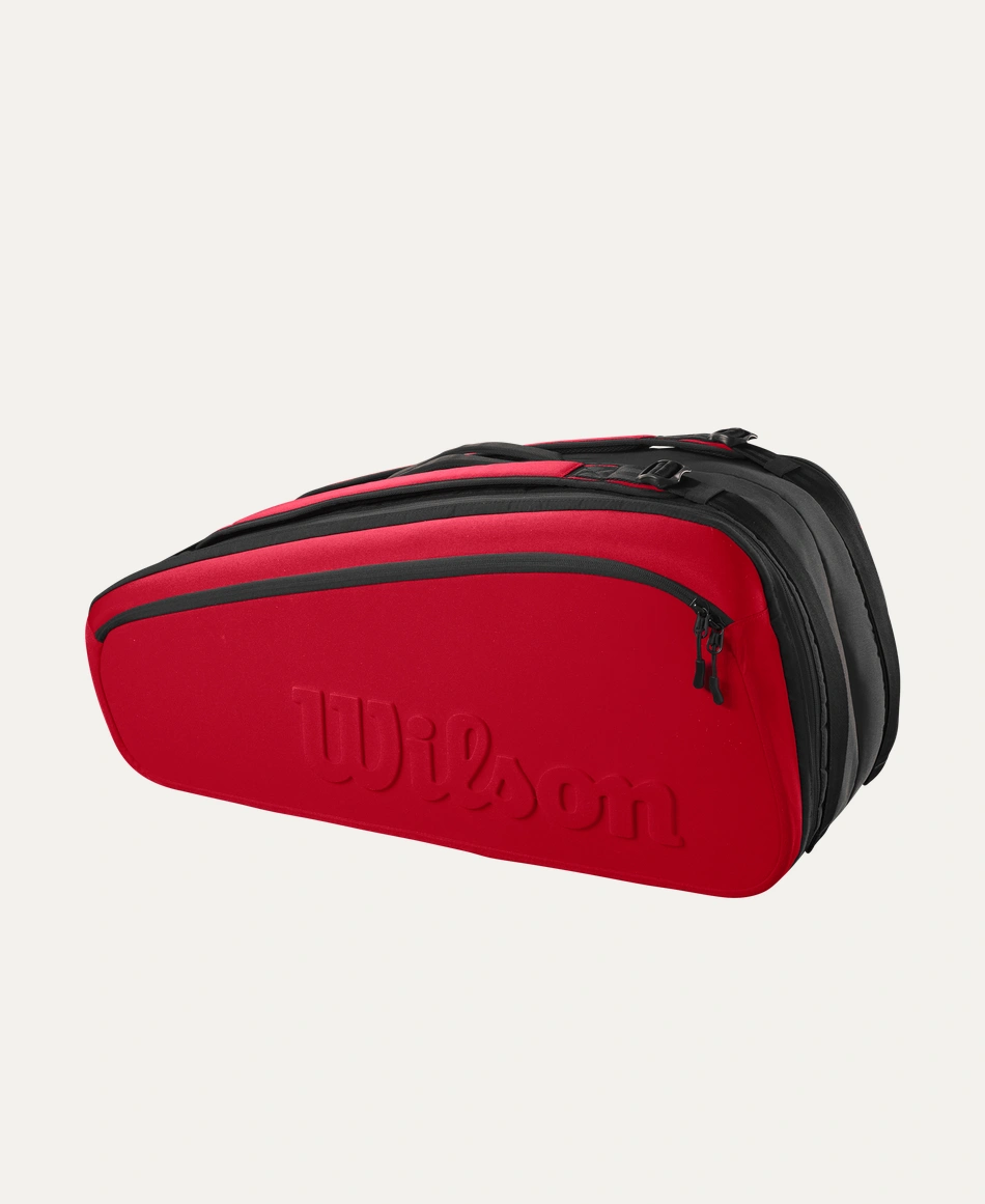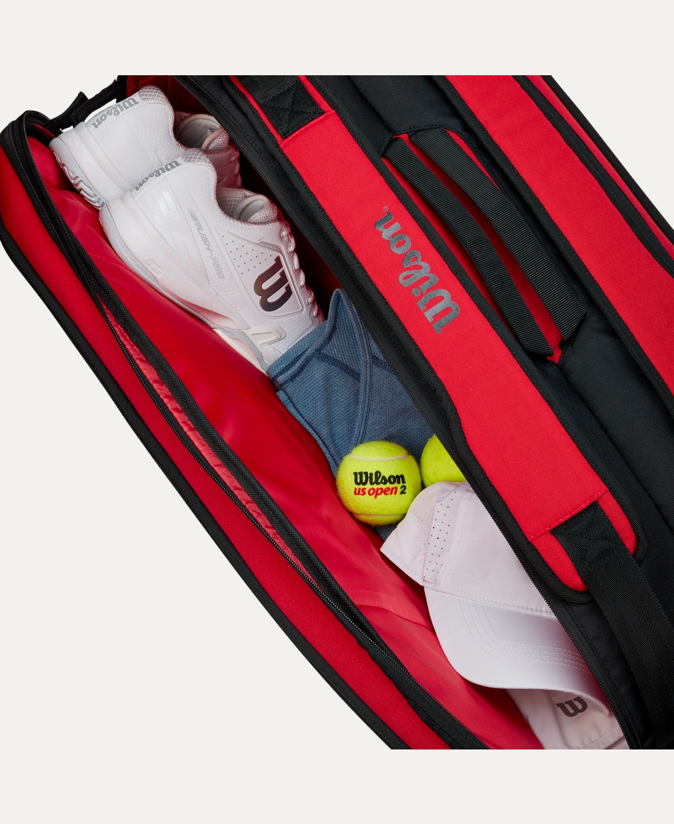 This Super Tour 9 Pack holds up to nine Tennis racquet across two main compartments for Tennis Equipment, including one lined with Thermoguard to protect against extreme temperatures. Additional features include a pair of large exterior side pockets for extra personal storage and a dual carry system for alternative modes of carrying. Comprising a recycled PET polyester shell fabric made from 21 PET bottles, this bag’s innovative design superbly complements the Clash v2 performance racquet line with its rich, red hue and embossed Wilson logo.