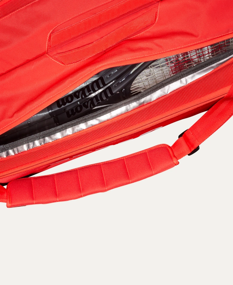 Superior quality, Tennis-oriented functionality and classic design collide introducing Wilson’s latest Super Tour bag collection. This bag comprises three main compartments that hold up to 9 Rackets, two large exterior side pockets and a dual carry system for optimal transportation. New to the line are reinforced side panels, which provide extra durability at spots that typically rip firs Tennis players will also appreciate the Thermoguard lining in one main compartment that protects contents wilting from extreme Hea Tennis
