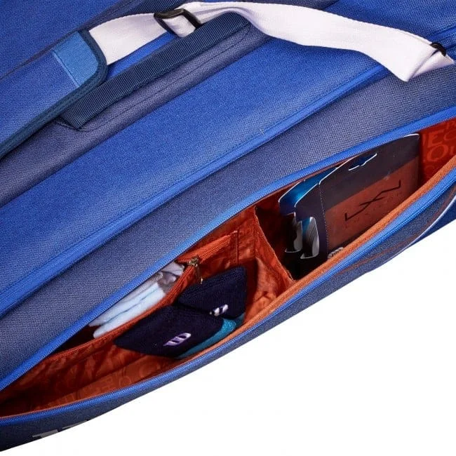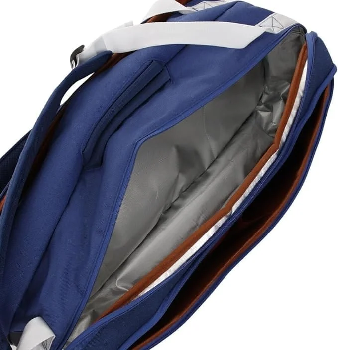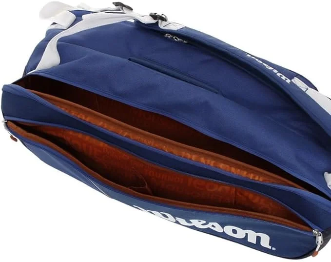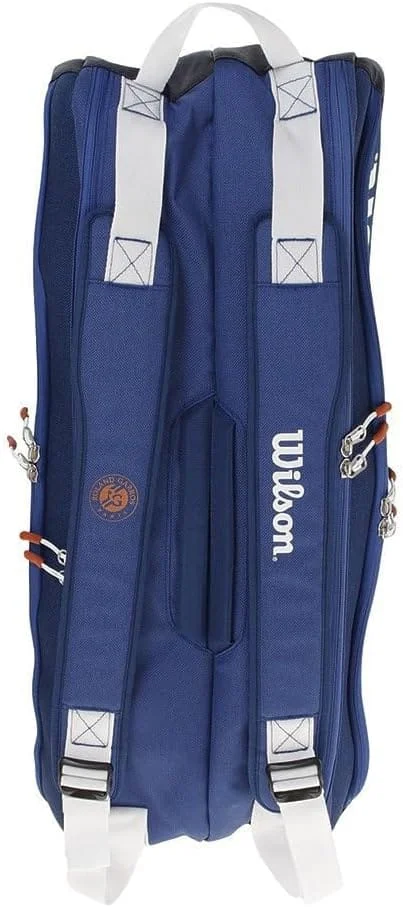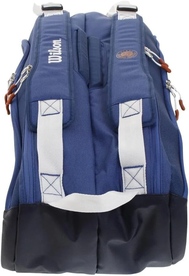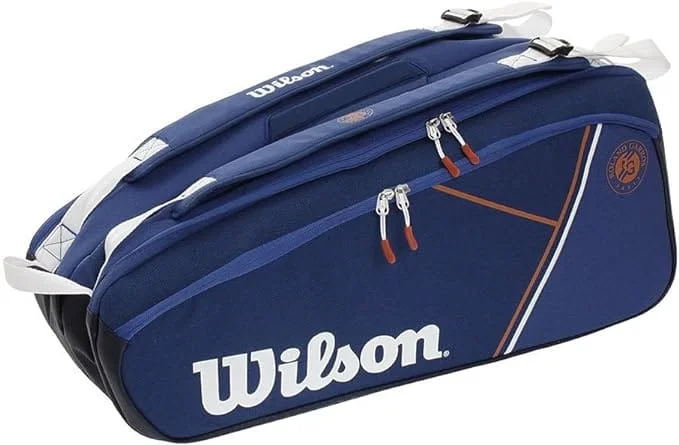 WILSON SUPER TOUR 9PK RG 2022 TENNIS BAG Description: The Roland Garros Super Tour collection embodies sophisticated style and supreme utility with a design inspired by the world’s most famous tournament on clay. This Super Tour 9 Pack features two compartments that provide plenty of room for Tennis gear and Equipment, including up to nine Tennis Rackets. A pair of large exterior pockets are perfect for smaller personal effects, while reinforced side panels supply enhanced durability. Equipped with removable Backpack shoulder straps as an additional carry option, this premium racket bag Captures the spirit of Roland Garros with official logos of the tournament on either side and along the straps. Durable, finely woven polyester shell fabric with PU coating Two main compartments for Equipment (up to 9 Rackets), apparel and Accessories Thermoguard lining in one outer main compartment to protect contents from extreme heat Two large exterior side pockets for personal storage Reinforced side panels lend extra durability Removable Backpack shoulder straps for additional carry option Adjustable padded shoulder straps Webbing loop for hanging Official logo of Roland Garros emblazoned on handle and each side of bag Bag Dimensions29 x 13 x 13″ / 73.5 x 33 x 33 cm Fabric Composition64% Polyester / 36%
