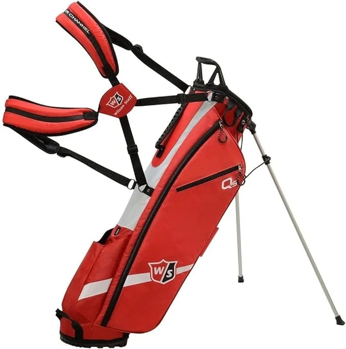 Practical And High Quality Red/White Carrying Case With Built-In Stand For Transporting Golf Clubs And Required Accessories Expanded Functions: 3D Foam-Lined 2-In-1 Dual Harness System With Hip Pads, Stroller Anchor, Glove Holder, Umbrella, Rain Cover And Towel Ring Useful Storage Facilities: 5 Large Top Slots, 5 Multi-Use Compartments Of Different Sizes, 2 Dividers Easily Store Rackets With 9.5 X 7 Inch Opening, All-Weather Adhesive Seams Contents: 1 X Wilson Golf Bag, Feather Golf Stand Bag, Including Foldable Stand, Weight: 1.7Kg, Material: Pu Nylon,